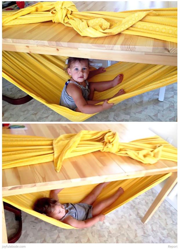 Ha van nagyobb étkezőasztalod, akkor egyszerűen készíthetsz a pöttömkédnek egy függőágyat, ahova elbújhat. Csak köss össze egy lepedőt vagy régi függönyt az asztal tetején, és voila, meg is vagy.