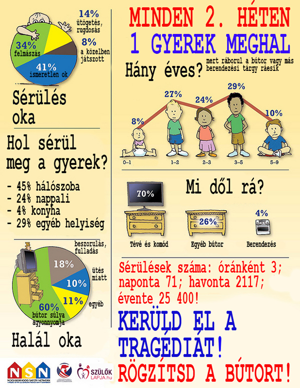 Mit tehetsz? A bútorok és a tv rögzítése macerás, ám szükséges feladat. Gyakran a szülőkben fel sem merül, hogy egy gyermek képes egy könyvespolcot magára rántani, pedig sajnos számos hasonló eset történt az elmúlt évek folyamán. Ha lehet, helyezzük el a tv-t a falra rögzítve, a bútorokat (szekrény, könyvespolc, komód, stb.) legalább 2 ponton rögzítsd horonnyal vagy pántokkal a falhoz. Így akkor sem dőlnek el, ha a csibészek felkapaszkodnak a bútorokra.