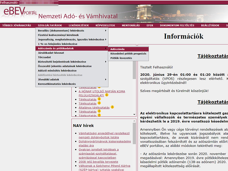 3. A Szolgáltatások menüpontban válaszd ki az Adószámla és pótlékadatok → Adószámla menüt