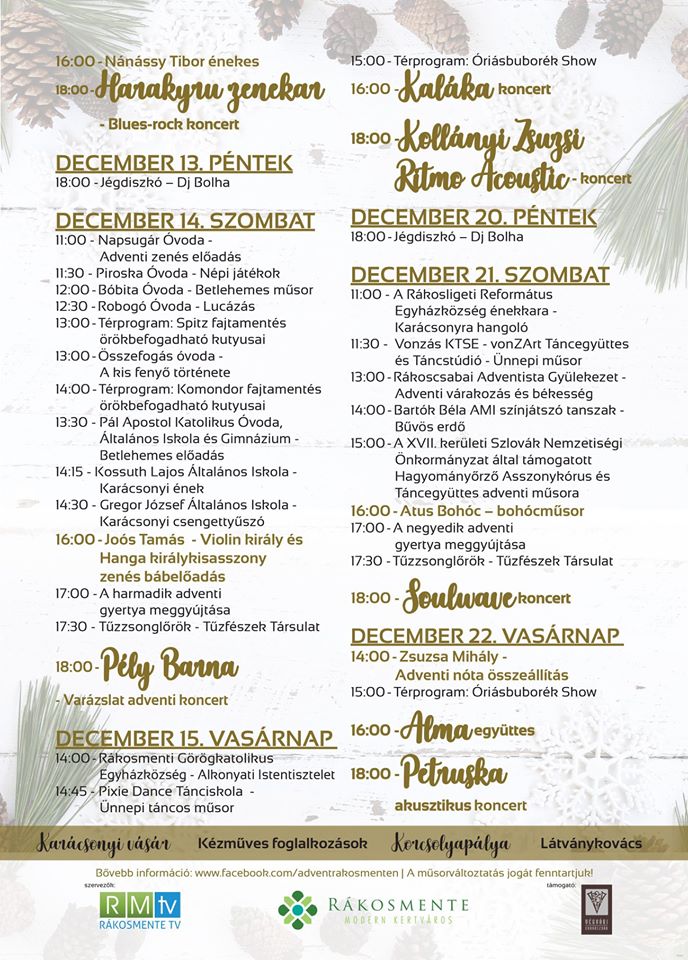 - december 21-22-én, az utolsó adventi hétvégén a Békéscsabai Hagyományőrző Kulturális Kör ünnepi összeállítását láthatják az érdeklődők