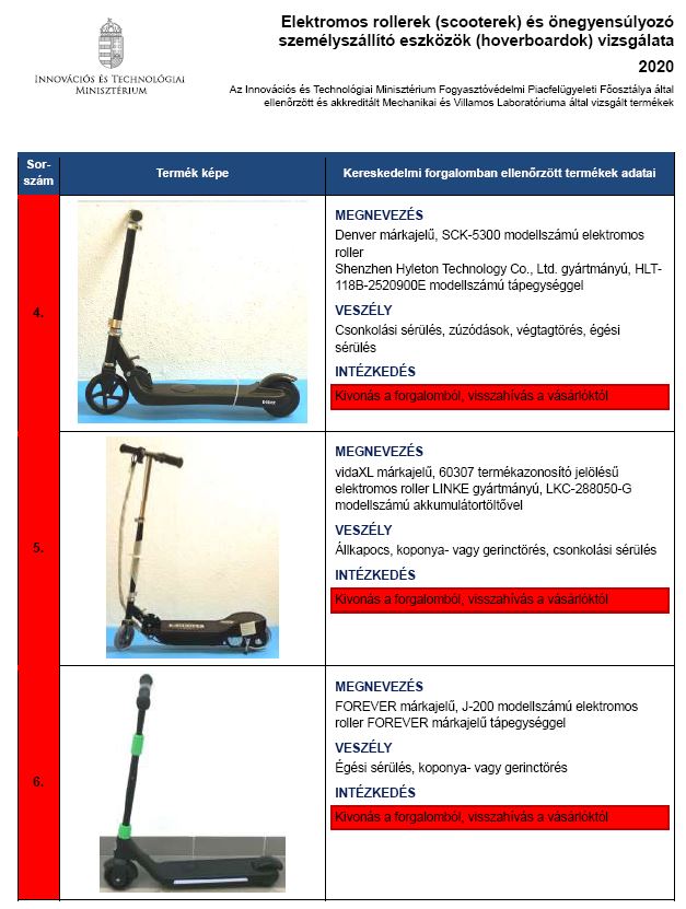A sérülésveszélyes kialakításuk miatt 4 e-roller és mindegyik hoverboard megbukott az ellenőrzésen. Utóbbiak közül kettő töltőjéről is megállapították, hogy áramütést okozhatnak.