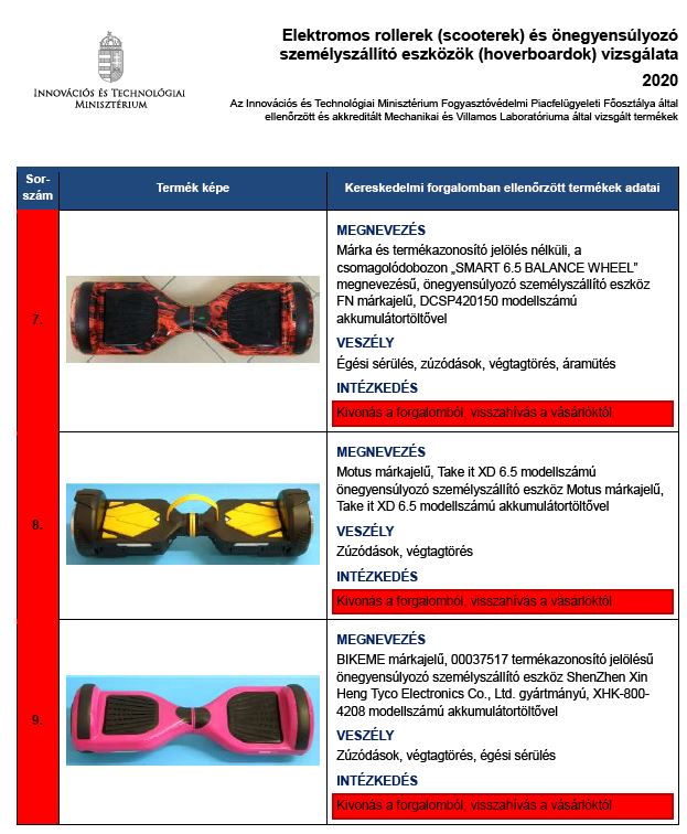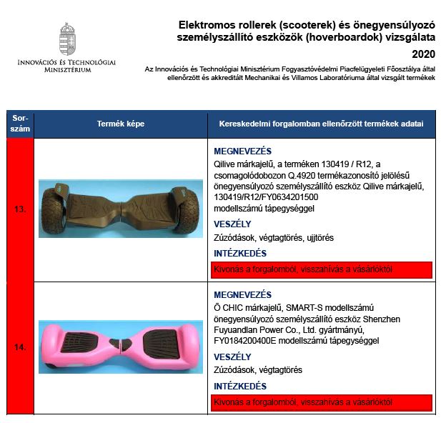 Közleményük szerint a termékbiztonsági ellenőrzések célja a veszélyes árucikkek kiszűrése, a balesetek megelőzése. Az ITM akkreditált Mechanikai és Villamos Laboratóriuma 6 elektromos rollert, 8 hoverboardot és akkumulátortöltőiket vizsgálta meg.