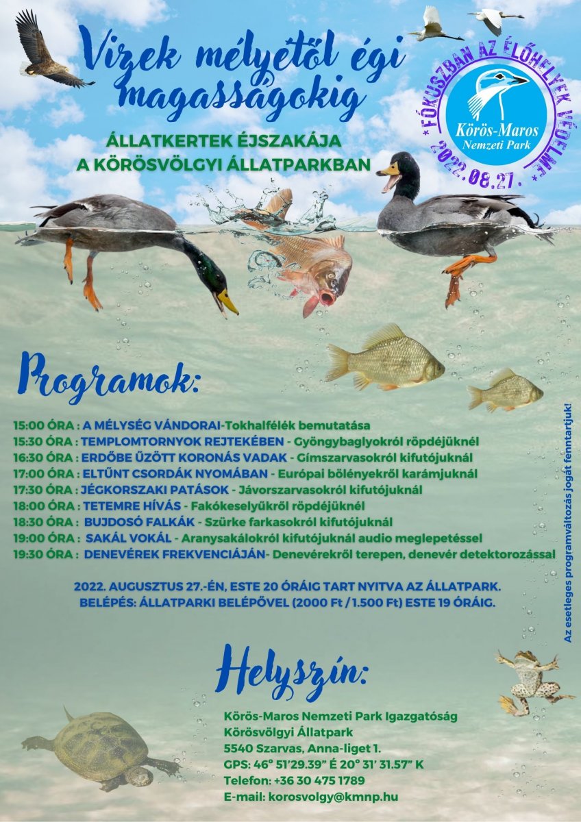 A vizek mélyétől az égi magasságokig mutatják be az állatok élőhelyeit augusztus utolsó szombatján, az Állatkertek éjszakáján a Körös-Maros Nemzeti Park Igazgatóság Körösvölgyi Állatparkjában Szarvason - tájékoztatta az igazgatóság közleményben az MTI-t.