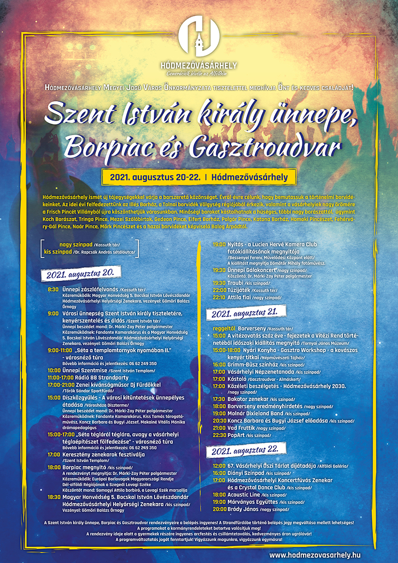 Hódmezővásárhelyen is több napos ünnepi programmal készülnek, augusztus 19-22. között rendezik meg a Borpiac és Gasztroudvar nevű eseményt is, melyen a különféle borvidékek bemutatása mellett színházi előadásokkal, koncertekkel és egyéb programokkal szórakoztatják a látogatókat.