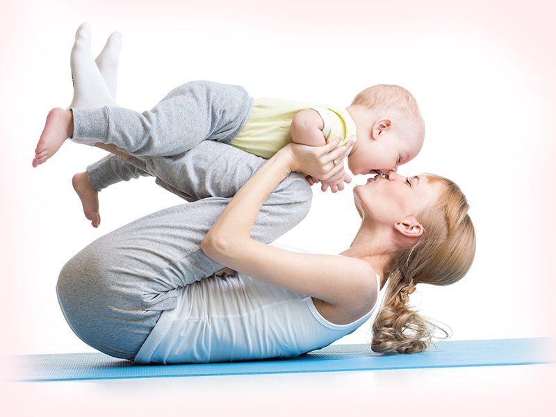 6. Lábakat nyomd fel törökülésben a pocakhoz, majd nyújtsd ki, lazítsd el. A csípő és térdízület mellett ez a gyakorlat az emésztésre is kedvező hatással van. A lábak felemelésekor hintáztathatod is a babát a hátán.