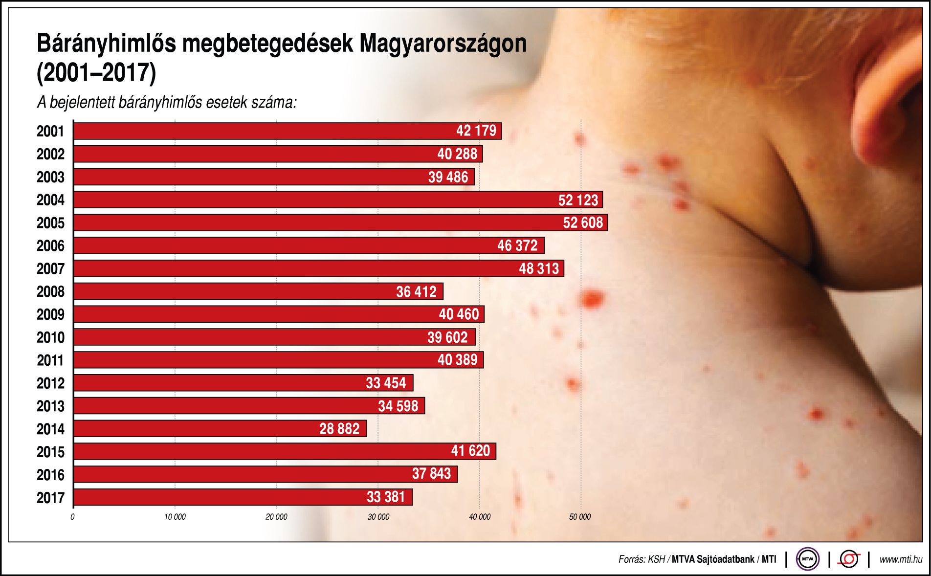 A bárányhimlő okozta megbetegedés elleni védekezésre kitérve elmondta, a bárányhimlő a bejelentett fertőző megbetegedések felét adja, 1998 óta a regisztrált fertőzések száma 28 000 és 52 000. Egy komolyan veendő betegségről van szó, amely egyes esetekben maradványtünetekkel gyógyulhat - emelte ki az államtitkár.