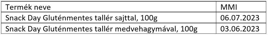 Termékek megnevezése: Snack Day Gluténmentes tallér sajtos, 100 g; Snack Day Gluténmentes tallér medvehagymával, 100g
