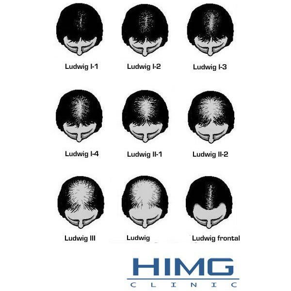 Nők esetében inkább a ritkulás a tipikus, általában diffúzan kopaszodnak, teljesen tar területek ritkán alakulnak ki. A hajvesztés jellegzetes megjelenési formája a nőknél a női mintakopaszság, vagyis angol szakkifejezéssel: Female Pattern Baldness. A női kopaszodást a Ludwig-skála osztályozza, ezt az alábbi képen láthatjuk: