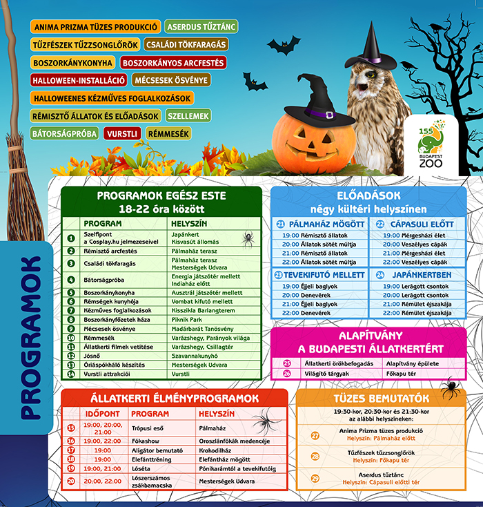 Ezen a napon napközben az Állatkert a szokásos rend szerint működik, majd este bezár, 18 órakor pedig újra kinyit, már az állatkerti halloweenre érkező látogatók előtt. Az éjjel 11 óráig tartó különleges hangulatú eseményen tűzzsonglőrökkel, tűztánccal és más tüzes produkciókkal, remek szelfi-, illetve fotótémát kínáló halloweeni installációval, családi tökfaragással, kézműves foglalkozásokkal, bátorságpróbával, rémmesékkel, boszorkányos arcfestéssel, boszorkánykonyhával, mécsesek ösvényével és vurstlival várják az érdeklődőket, és az is kiderül, hogy miért tartanak egyes állatokat rémisztőnek, vagy hogy a régi idők embere miért hozott bizonyos állatokat összefüggésbe a szellemekkel, vagy éppen a boszorkányokkal.