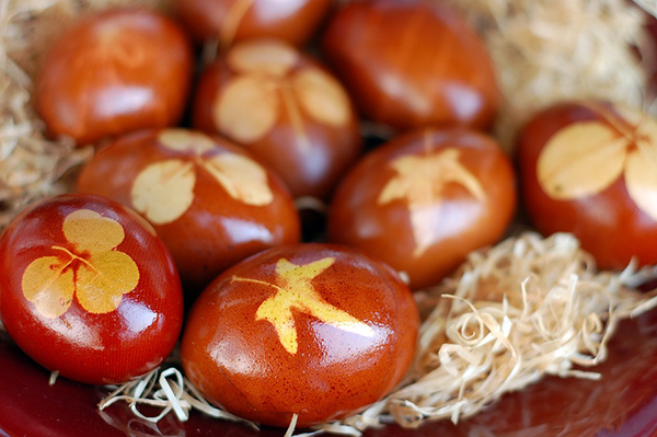 A főtt tojásokra bevizezett petrezselyem levelet simítunk, óvatosan nejlonharisnyába csomagoljuk és bő festékfürdőbe helyezzük. Nagyon szép levéllenyomatokat kapunk. Jól ismert, régi tojásdíszítési technika, amit a gyerekek biztosan szeretni fognak.