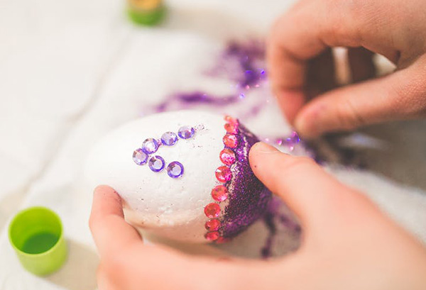 Hobbiboltokban kapható gyöngyöket, dekorköveket, flittereket, apró virágokat ragassz rá a kész festett húsvéti tojásokra – és máris kész a trendi húsvéti tojás.