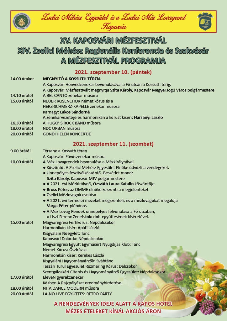 Pénteken és szombaton rendezik meg a méhészek hagyományos találkozóját és kirakodó vásárát, a 15. Mézfesztivált Kaposváron. A programok már péntek reggel 9:00 órakor elkezdődnek a Kossuth téren és a Fő utcán, többek közt a Mézlovagrendek bevonulásával és térzenével. A hivatalos megnyitó 14 órakor lesz pénteken.