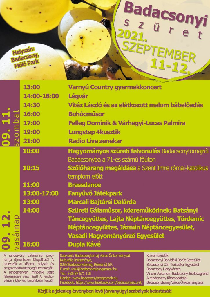A két nap során a vasárnapi fő attrakció, a szüreti felvonulás mellett, egyéb kulturális és gyerekprogramokkal várják a borok szerelmeseit a rendezvény színpadán Badacsonyban a Móló Parkban.