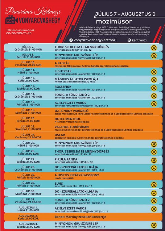 A vonyarcvashegyi kertmozi igazi klasszikus a Balaton-parti kertmozik között, hiszen - kisebb-nagyobb kihagyásokkal - már több mint 30 éve látogathatják a mozirajongók. Idén nyáron is minden nap várnak mindenkit egészen augusztus végéig, a vetítések minden nap 21:00 órakor kezdődnek.