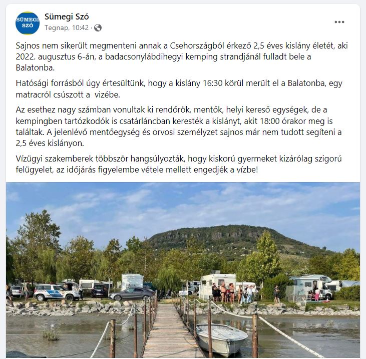 Két és fél éves kislány fulladt a Balatonba szombaton - Egy matracról csúszott a vízbe Sajnos nem tudták megmenteni annak a kislánynak az életét, aki Csehországból érkezett a családjával nyaralni a badacsonylábdihegyi kempingbe, de a kemping strandjánál a Balatonba fulladt. Sajnos nem tudták megmenteni annak a kislánynak az életét, aki Csehországból érkezett a családjával nyaralni a badacsonylábdihegyi kempingbe, de a kemping strandjánál a Balatonba fulladt, közölte a Sümegi Szó.