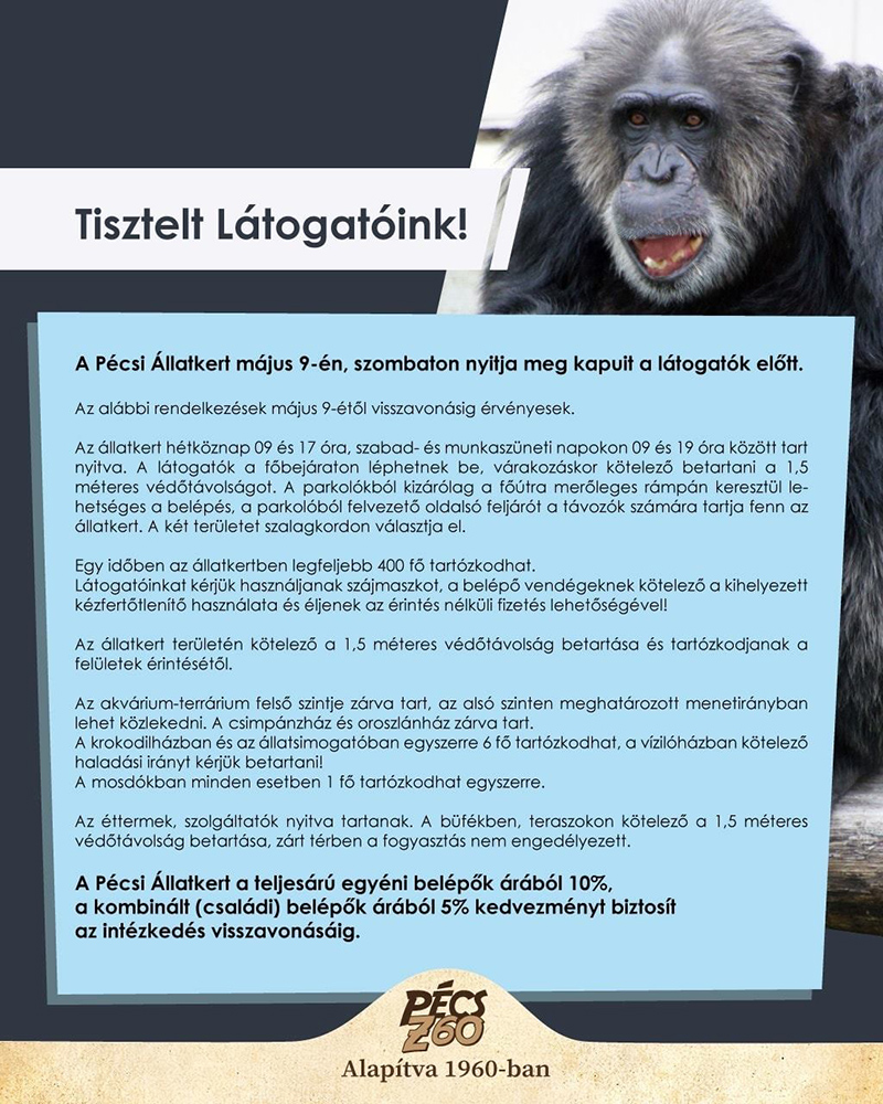 Május 9-én, szombaton 9:00 órától ismét fogadják a látogatókat a Pécsi Állatkertben. Látványetetéseket nem tartanak, a csimpánzház és az oroszlánház sem látogatható, az akvárium-terrárium felső szintjét sem nyitják még ki.
