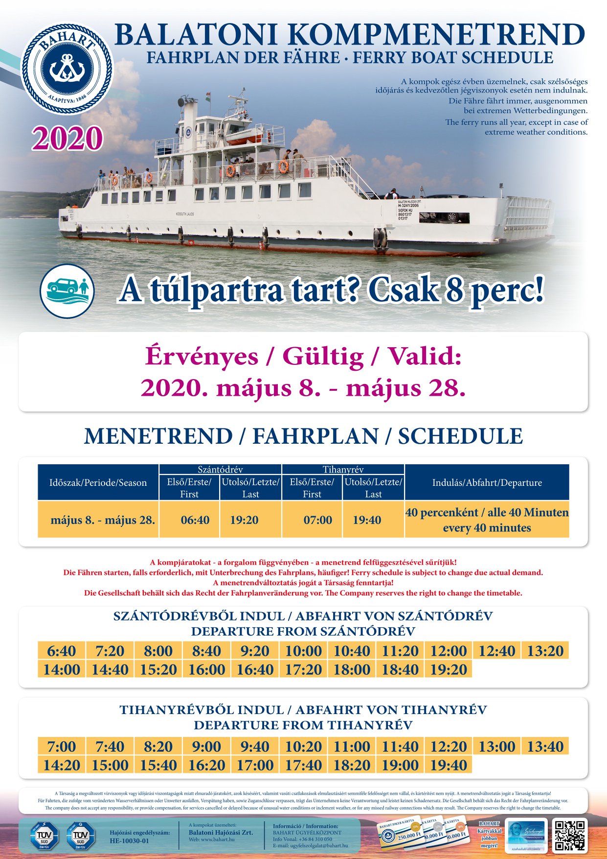 A május 8-tól május 28-ig bevezetett menetrend szerint a kompok Szántód felől 6.40 és 19.20 között, Tihany felől 7.00 és 19.40 között közlekednek 40 percenként. A járatokat nagy forgalom esetén sűrítik. További részleteket a cég hivatalos honlapja, a www.bahart.hu közöl.