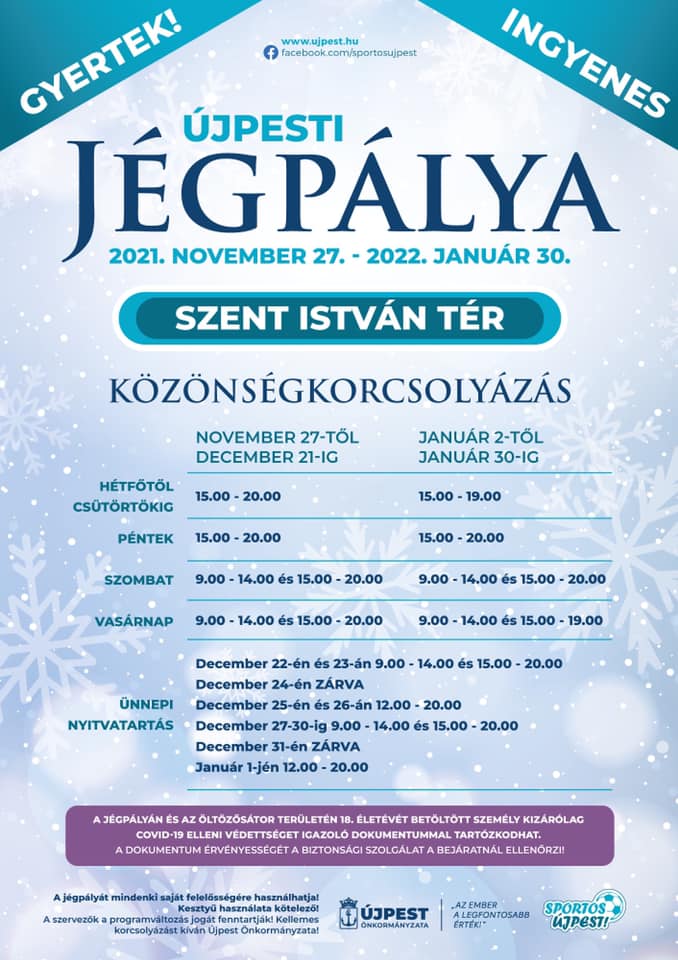Hétfőtől péntekig 15:00 órától 20:00 óráig, hétvégente és ünnepnapokon pedig 9:00-től 20:00 óráig lehet korizni a jégen. Legyen nálad védettségi igazolvány, mert a jégpályára 18 év felettiek csak ezzel a dokumentummal léphetnek.