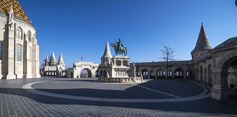 Budapest, 2020. március 16. Az új koronavírus-járvány miatt elnéptelenedett Halászbástya a budai Várban 2020. március 16-án. Középen Szent István lovas szobra látható.