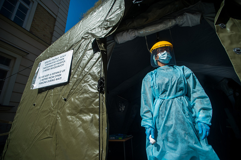 Budapest, 2020. március 16. Védőfelszerelést viselő nővér áll a Honvédkórház Róbert Károly körúti székhelyén felállított elővizsgálati sátornál 2020. március 16-án. A koronavírus miatt kialakult járványügyi helyzetre való tekintettel a Honvédkórházban kizárólag az elővizsgálati ponton történő áthaladást követően lehet igénybe venni minden járó- és fekvőbeteg ellátást. Az elővizsgálat lázmérésből és kérdőív kitöltéséből áll, amely mindenkinek kötelező.