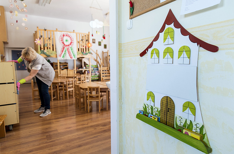 Győr, 2020. március 16. A bútorokat fertőtleníti egy óvónő a győri Prohászka Ottokár Orsolyita Gimnázium, Általános Iskola és Óvoda egyik óvodai csoportszobájában 2020. március 16-án. Az intézmény több mint százfős óvodájába ezen a napon egy gyereket sem vittek be. A koronavírus-járvány megfékezése érdekében hozott intézkedések keretében ettől a naptól Győrben is bezárnak a bölcsődék és az óvodák. Az önkormányzati, egyházi és alapítványi fenntartású intézményekben kizárólag gyermekfelügyeletet biztosítanak azoknak, akik semmilyen formában nem tudják megoldani gyermekük felügyeletét.