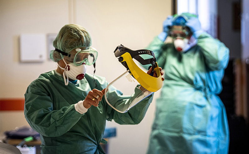 Budapest, 2020. március 16. Védőfelszerelést viselő nővérek a koronavírussal érintett új betegek fogadására kialakított egyik osztályon a fővárosi Szent László Kórházban 2020. március 16-án.