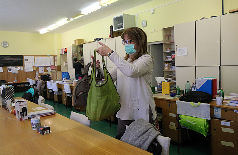 Miskolc, 2020. március 16. Podhorszky Judit tanárnő összepakolja és hazaviszi a személyes tárgyait a tanári szobából a Miskolci Herman Ottó Gimnáziumban 2020. március 16-án. Az új koronavírus-járvány terjedésének megfékezése érdekében mától bezártak az iskolák és elkezdődik a digitális tanrendre való átállás.