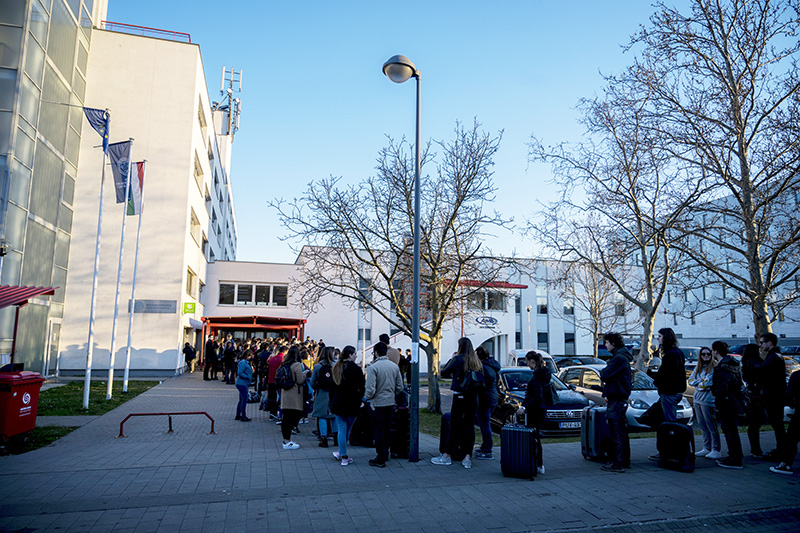 Pécs, 2020. március 16. Hallgatók várakoznak a kiköltözésre a Pécsi Tudományegyetem Szalay László Kollégium épülete előtt Pécsen 2020. március 16-án. A koronavírus-járvány miatt a kormány intézménylátogatási tilalmat rendeltek el a magyarországi egyetemeken, csak távoktatásban folytatható az oktatás.
