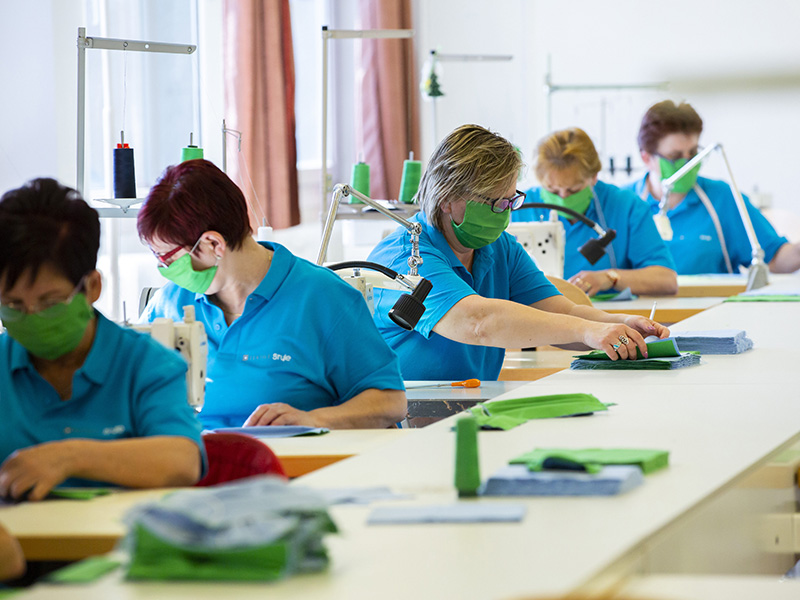 Nagykanizsa, 2020. március 18. Védőmaszkokat gyártanak a Kanizsa Rehab Nonprofit Kft. nagykanizsai varrodájában 2020. március 18-án. A védőmaszkok speciális szűrővel nem rendelkeznek, de kétrétegű orvosi szövetből készülnek, 90 Celsius-fokon moshatók és fertőtleníthetők. Az első tízezer darabot a helyi önkormányzat rendelte meg saját intézményei számára.