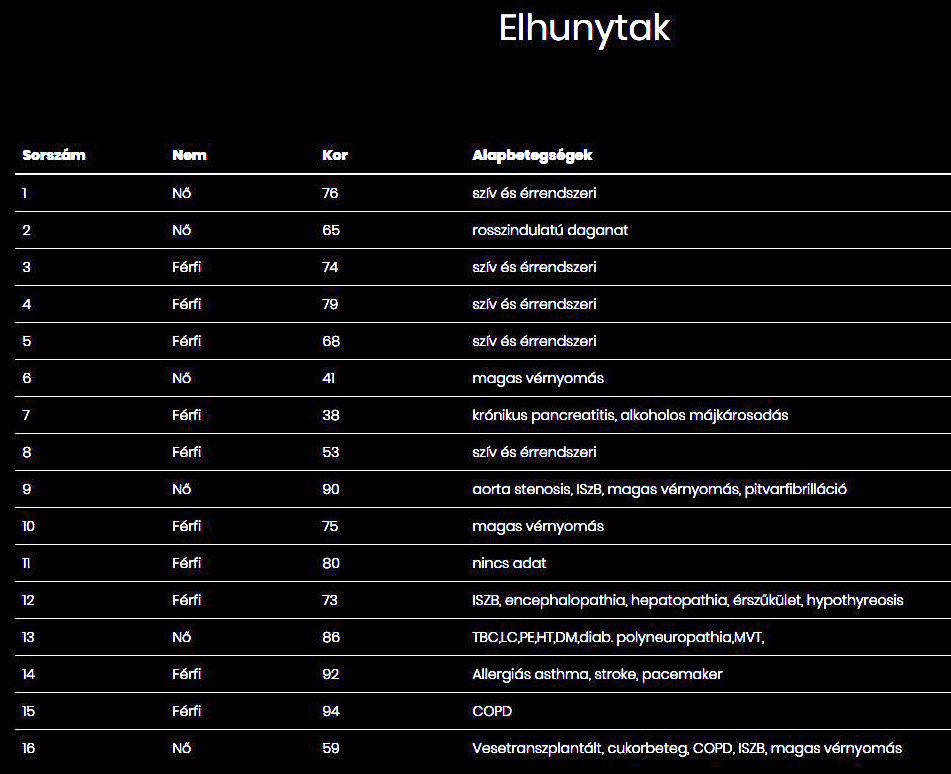 Ezentúl részletesebb adatokat osztanak meg a kormány hivatalos koronavírussal foglalkozó oldalán: látható lesz az elhunytak kora, neme és krónikus alapbetegsége(i) is. Március 31-én megérkeztek az első részletes adatok.