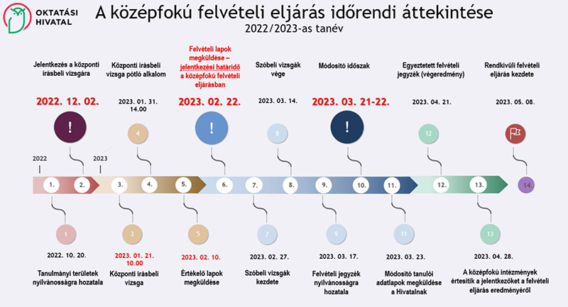 Az általános iskolák jellemzően 2023. január elején, de legkésőbb február közepéig összegyűjtik a nyolcadikosok továbbtanulási szándékait, és ezek alapján, legkésőbb 2023. február 22-ig állítják elő a KIFIR rendszerben a felvételi lapokat. A kinyomtatott és aláírt jelentkezési lapokat el is kell juttatni a középfokú intézmény postázási címére - ezt az általános iskola végzi, a postára adás határideje: 2023. február 22.