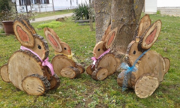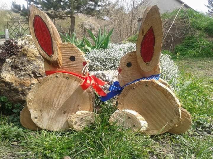 Nyuszi ül a fűben... Nézzétek, milyen fantasztikus dologra bukkantunk az egyik közösségi oldalon! Farönkök, faágak, fakorongok és egy kis festék, valamint szalagdísz és szalma segítségével igazi húsvéti hangulat varázsolható a kertbe, igaz?