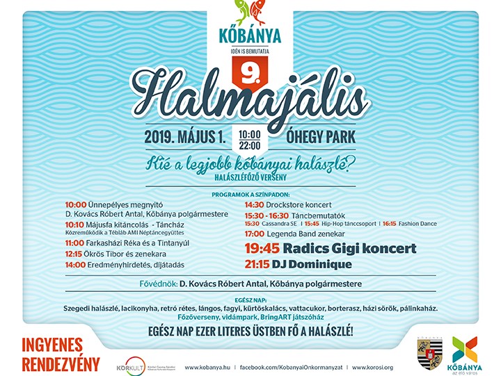 Egész nap fő majd a halászlé a halászléfőző versenyen, de a színpadon koncertek, gyermekműsorok lesznek láthatók, a gyerekeket pedig kézműves foglalkozások, vidámpark és játszóház is csalogatja, ha kilátogat a család a kőbányai Halmajálisra. Este Radics Gigi koncert, majd DJ Dominique.