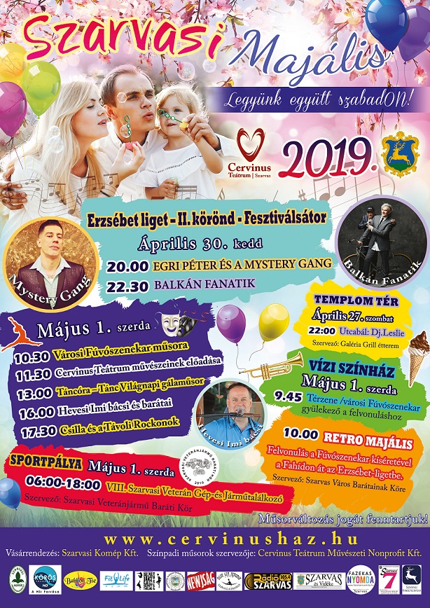 Változatos családi és kulturális programokkal várnak minden érdeklődőt 2019. május 1-én a hajdúszoboszlói majálisra. A rendezvények helyszíne a Kovács Máté Kulturális Központ melletti Halasi-Fekete Péter tér.
