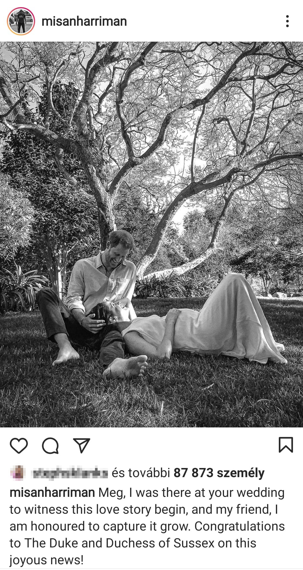 - Örömmel tudatjuk, hogy Archie hamarosan nagytestvér lesz, Sussex hercege és hercegnéje második gyermeküket várják - közölte a pár szóvivője 2021. február 14-én, Valentin-napon, a nagy hírt pedig egy fekete-fehér fotóval is megerősítették, melyet barátjuk és fotósuk, Misan Harriman készített. A fotós Instagram-oldalán posztolt képen Meghan Markle egy Carolina Herrera ruhát visel, mely még akkor készült, amikor Archie-val volt várandós.