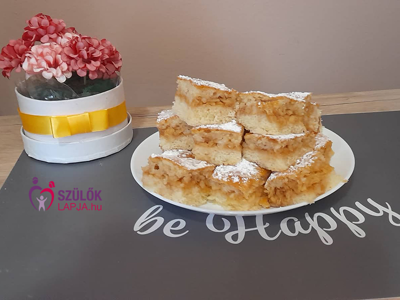 - A tésztát kivesszük a sütőből, rásimítjuk az almás réteget, majd a maradék tésztát a tetejére öntjük