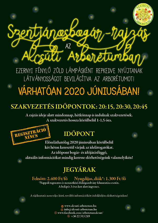 Az Alcsúti arborétumban a korábbi évekhez hasonlóan idén is lesz szentjánosbogár-rajzás, de a pontos kezdetét még nem tudni, így minden látogatót türelemre kérnek. A szakvezetések a rajzás alatt minden nap (hétköznap is) a következő időpontokban indulnak, akár 2 csoporttal is: 20:15; 20:30; 20:45