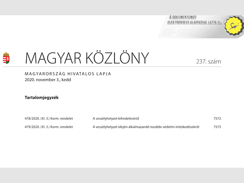 A koronavírus-járvány miatt a kormány döntésének megfelelően 2020. november 4., szerdától életbe lépett a rendkívüli jogrend. A kormány a koronavírus-világjárvány következményeinek elhárítása, a magyar állampolgárok egészségének és életének megóvása érdekében Magyarország egész területére veszélyhelyzetet hirdetett ki.Megjelentek a Magyar Közlönyben a veszélyhelyzet kihirdetéséről és a veszélyhelyzet idején alkalmazandó további védelmi intézkedésekről szóló kormányrendeletek, melyekről Orbán Viktor november 3-án este beszélt a Facebook-oldalán.