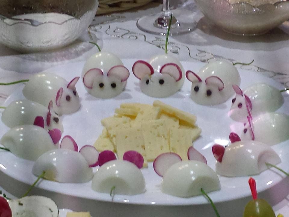 Az egérkék füle retekből, a szemük feketeborsból készült. A fekete bors kiváltható: fekete olivabogyó-szelettel, mazsolával, kaviárral, főtt lencsével. (Ragasztóanyagnak bármilyen sajtkrém jó lehet). A humor kedvéért ne felejts el szeletelt uzsonnasajtot tenni a tányér középére.