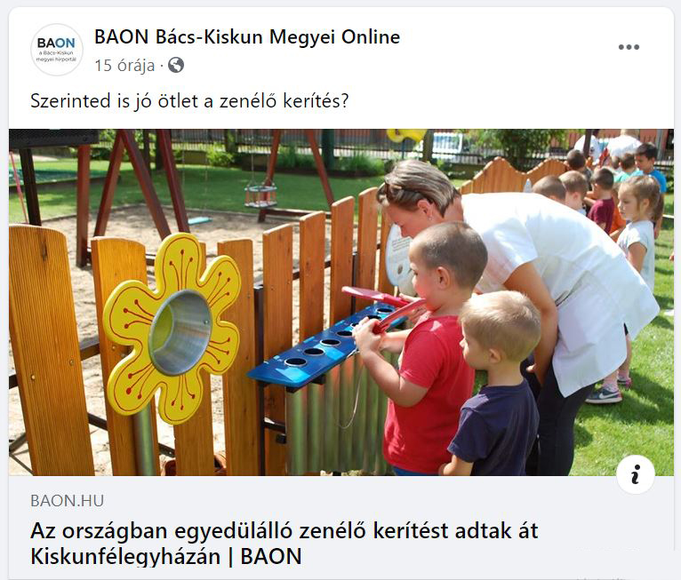Zenélő kerítés az óvodában: Különleges hangszeres játszóteret adtak át Kiskunfélegyházán - Miért fontos a zene a gyerekeknek? Az országban egyedülálló, hangszeres játszóteret alakítottak ki a kiskunfélegyházi Százszorszép Óvodában, a zenélő kerítést július 20-án, hétfőn adták át. Miért fontos a zene, a zenélés a gyerekeknek? Az országban egyedülálló, hangszeres játszóteret alakítottak ki a kiskunfélegyházi Százszorszép Óvodában, a "zenélő kerítést" július 20-án, hétfőn adták át.